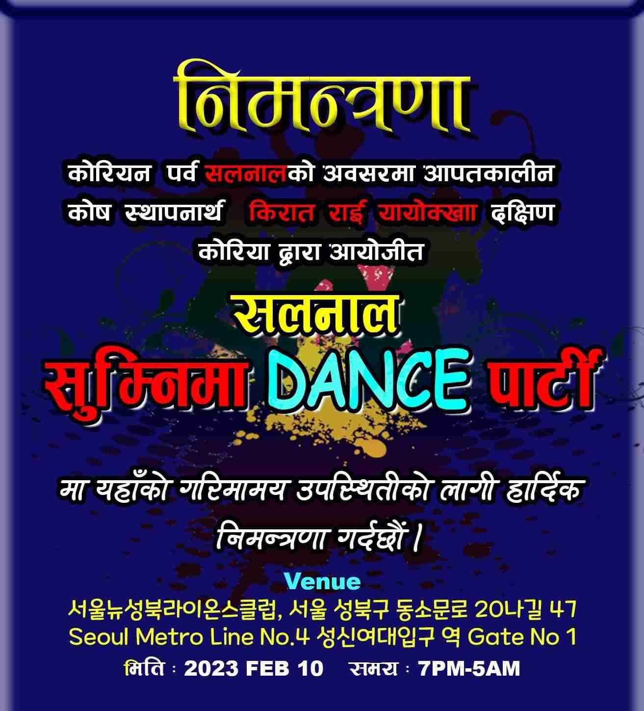 किरात राई यायोक्खा द्वारा आयोजित सलनाल सुम्निमा डान्स पार्टीको सम्पूर्ण तयारी पूरा गरिएको छ। दक्षिण कोरियाको महत्त्वपूर...