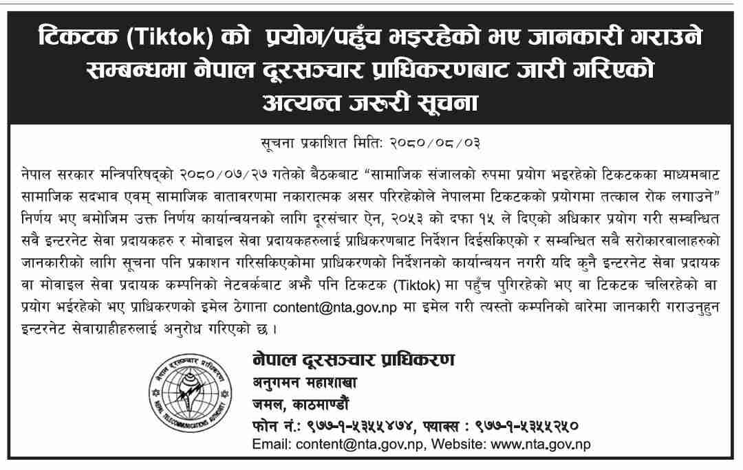 नेपाल दूरसञ्चार प्राधिकरणले यहाँ रहेका नेपाली जनताहरुलाई टिकटक प्रयोग गरिएको छ वा छैन भनेर जानकारी प्राप्त गर्नका लागि अ...